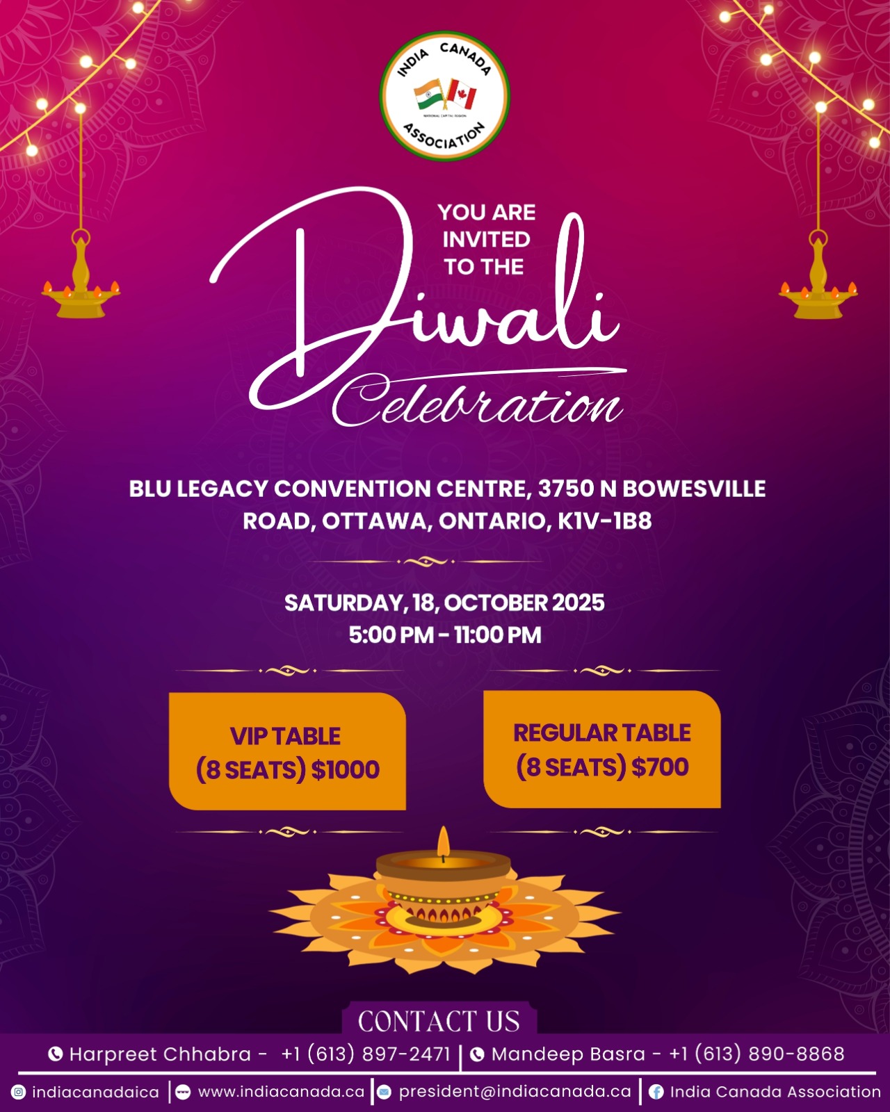 Blu Legacy Convention Centre 3750 N Bowesville Rd, Ottawa, Ontario, CanadaYou're invited to a dazzling evening of joy and celebration at the ICA Diwali Celebration on October 18, 2025! Savor a wide array of delicious dishes at our buffet, and soak in the festive atmosphere with vibrant performances that will brighten the night. Dance the night away to electrifying beats by DJ Jas, and create unforgettable memories with your loved ones.